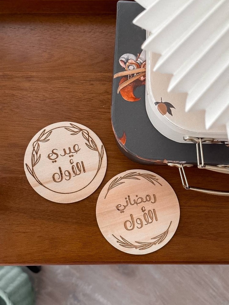 مجموعة مكونة من قطعتين خشبيتين بخط عربي وتصميمات مميزة احتفالاً بأول رمضان و عيد لطفلك.